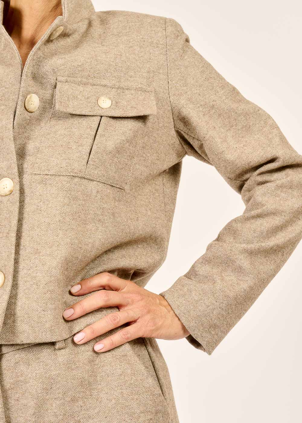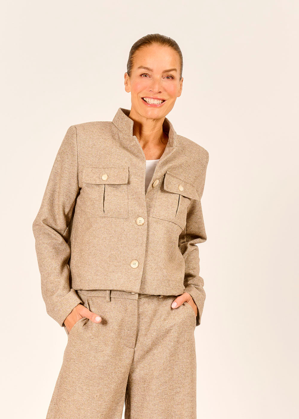 Diese stilvolle Kurzjacke in warmem Karamell besticht durch ihr lässiges und zugleich elegantes Design. Die aufgesetzten Brusttaschen verleihen dem Look eine sportive Note, während der moderne Schnitt die Figur gekonnt umspielt. Ein vielseitiges Key-Piece, das sowohl solo als auch im Set getragen werden kann und Ihrem Outfit eine raffinierte und lässige Note verleiht.