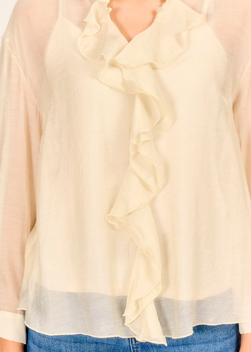 Diese feminine Bluse verzaubert mit zarten Rüschen, die das Dekolleté stilvoll betonen und dem Look eine romantische Leichtigkeit verleihen. Das fließende Material umspielt die Figur und sorgt für eine elegante Silhouette, die sowohl im Büro als auch bei festlichen Anlässen überzeugt. Durch ihr dezentes Design ist die Bluse vielseitig kombinierbar und wird zum absoluten Lieblingsteil in Ihrer Garderobe. Ein unverzichtbares Basic, das Sie im Handumdrehen in eine stilvolle Fashionista verwandelt.