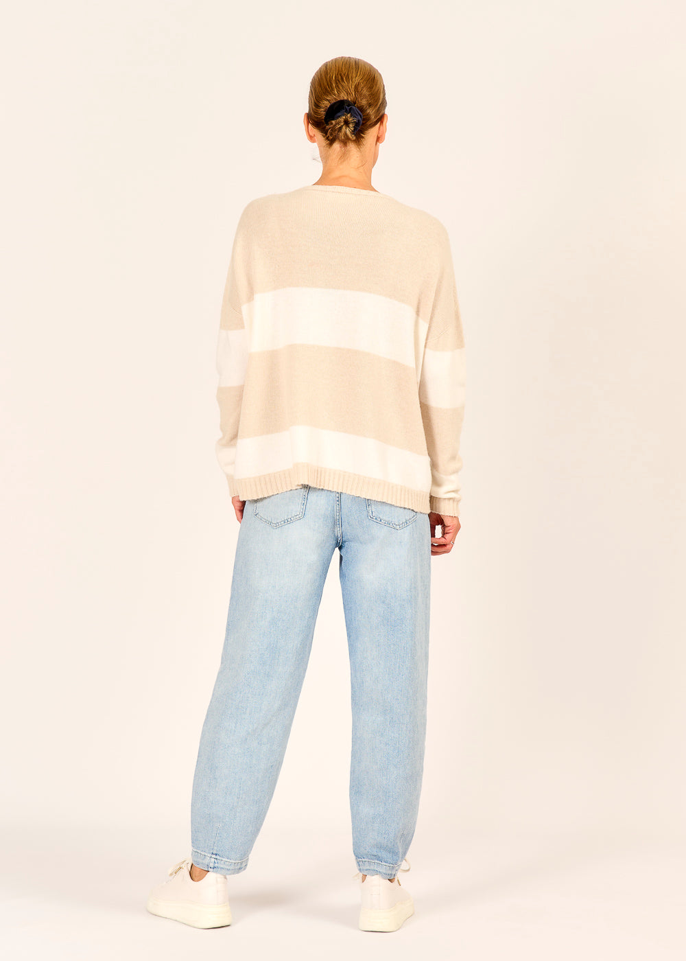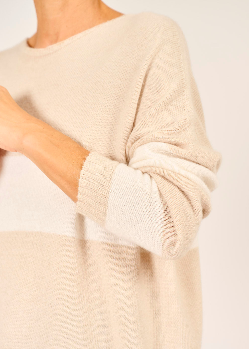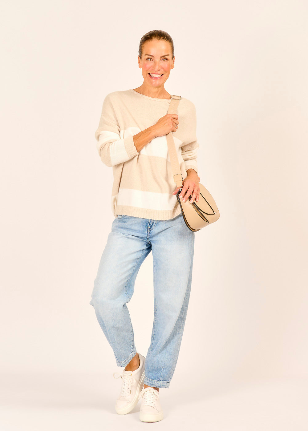 Dieser edle Ringelpullover aus einer hochwertigen Mischung mit 40% Merinowolle ist ein Must-have für kühlere Tage. Die zarten Streifen in Beige- und Cremetönen wirken zeitlos und verleihen dem Pullover eine besonders elegante Note. Dank seines weichen Materials und des lässigen Schnitts ist er nicht nur stilvoll, sondern auch unglaublich bequem zu tragen.