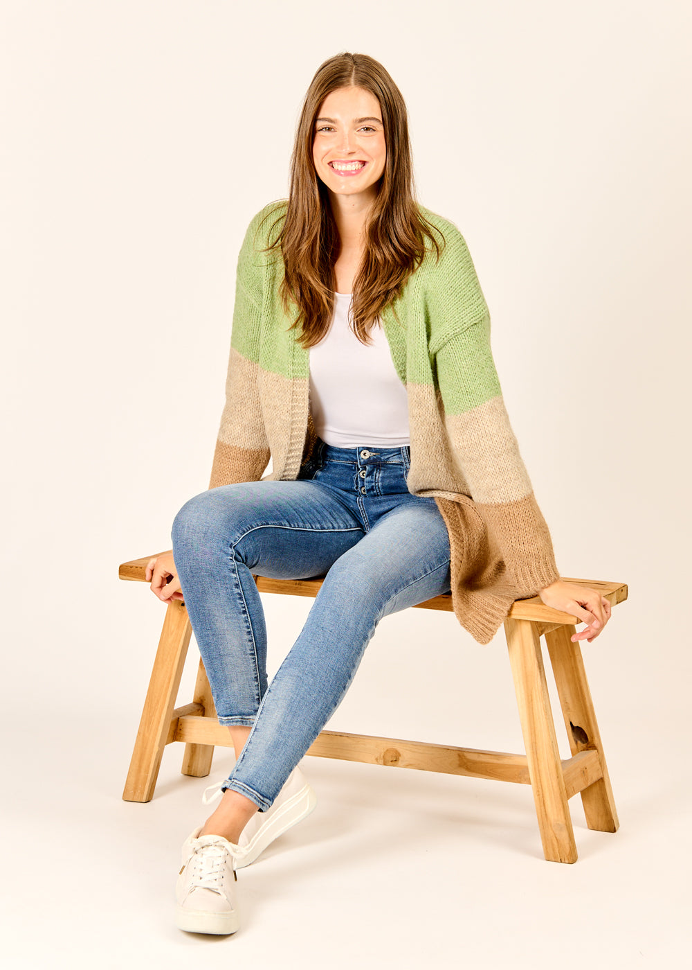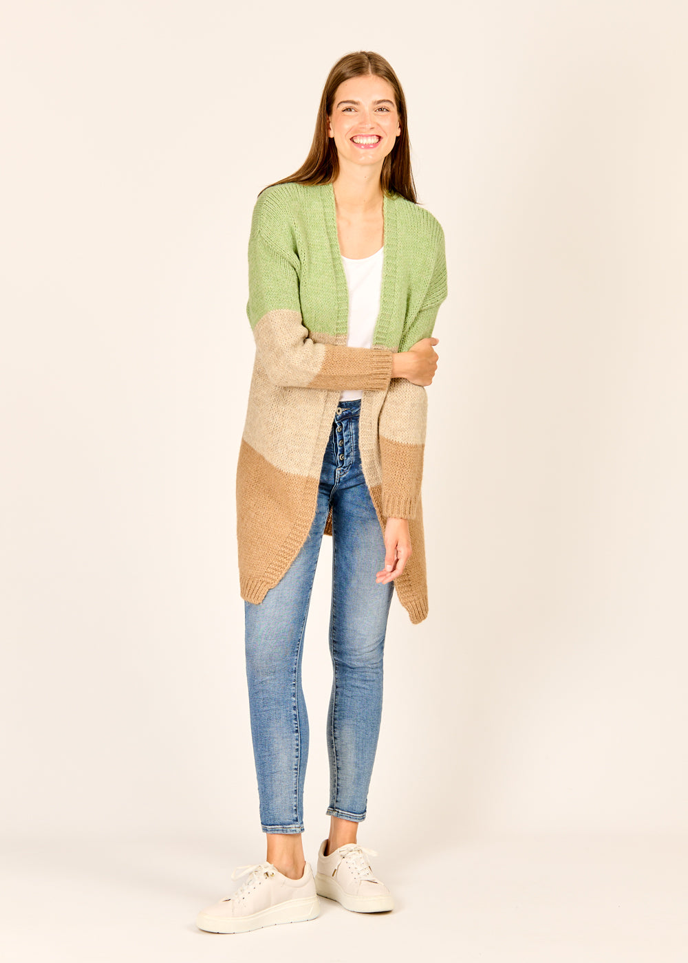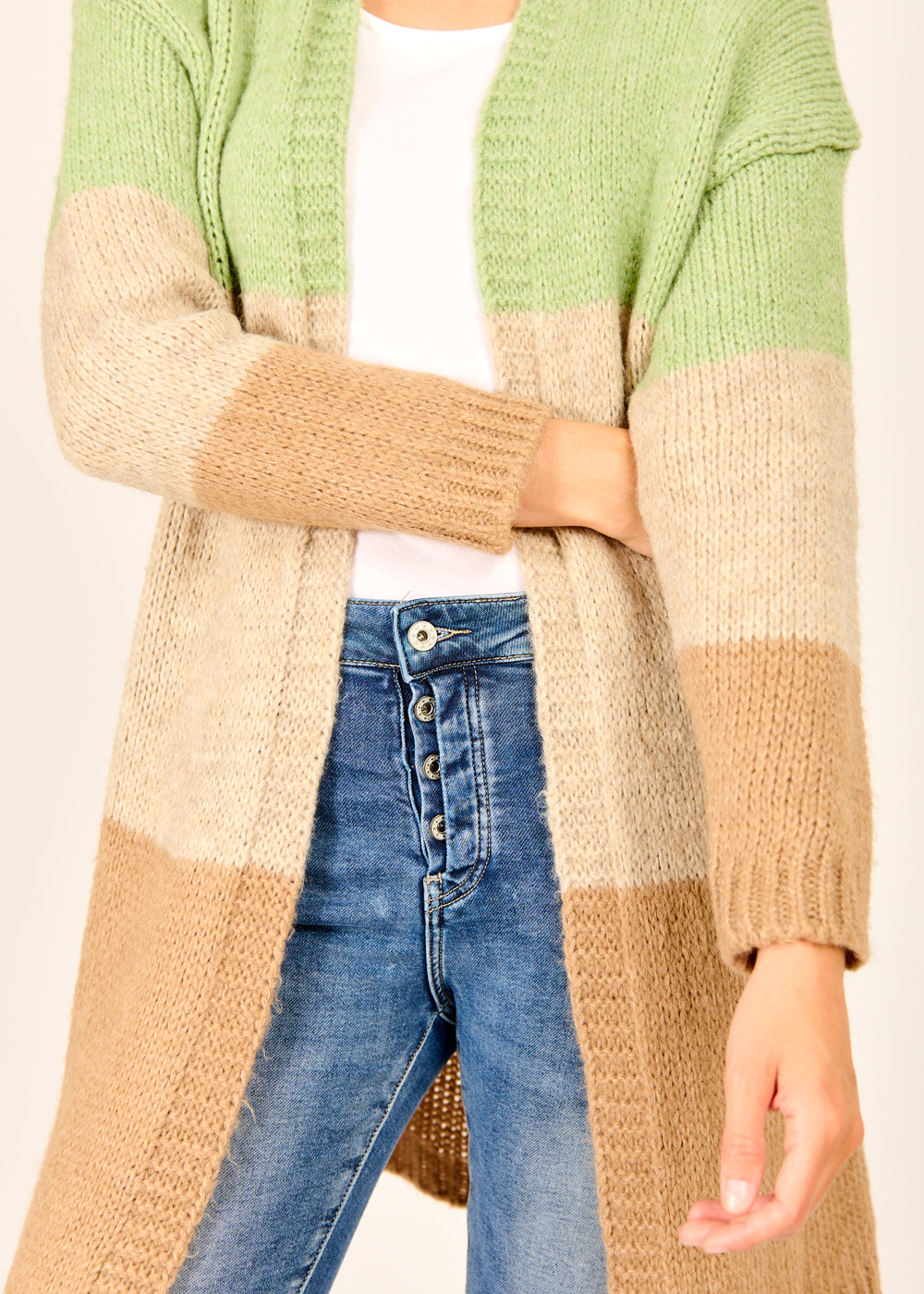 Dieser stilvolle, dreifarbige Cardigan ist der perfekte Begleiter für kühle Tage und überzeugt durch sein harmonisches Blockstreifen-Design. Die Kombination aus zarten Naturtönen verleiht jedem Outfit eine elegante Note und lässt sich wunderbar vielseitig kombinieren. Gefertigt aus einem weichen und wärmenden Material, bietet er nicht nur eine luxuriöse Haptik, sondern auch behaglichen Tragekomfort.