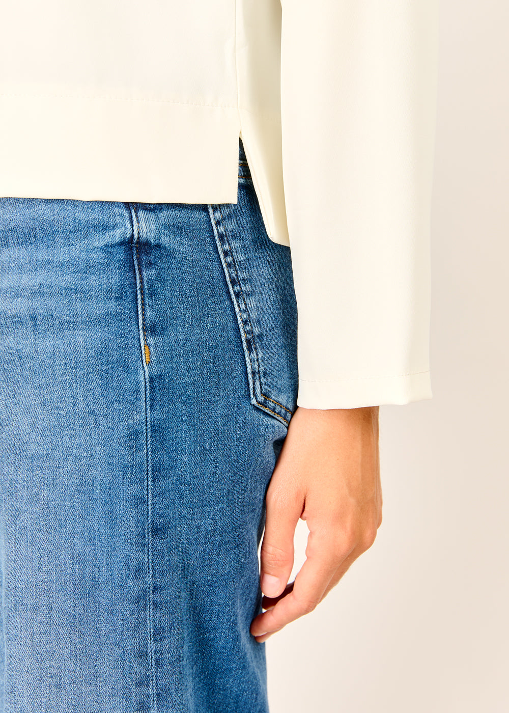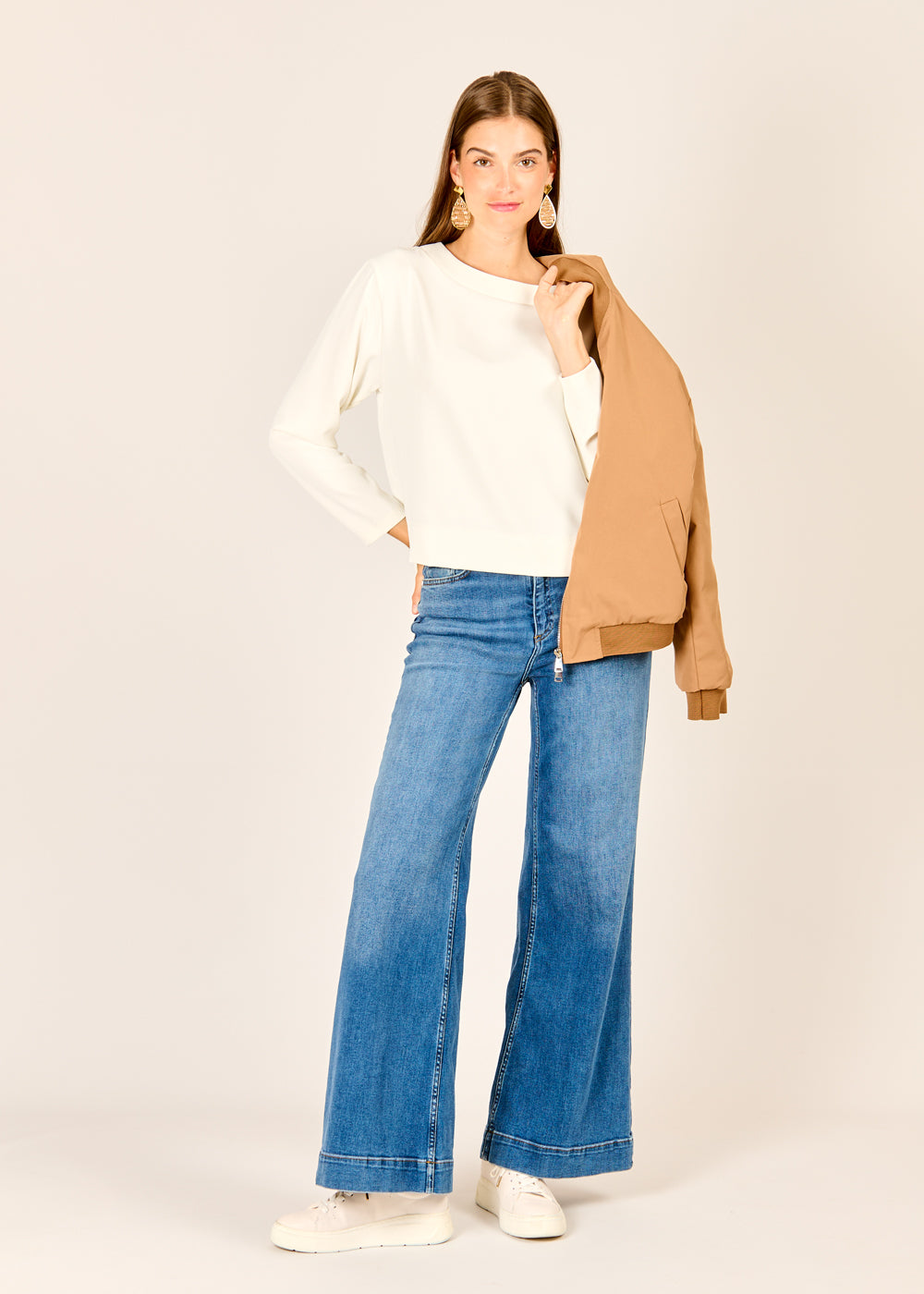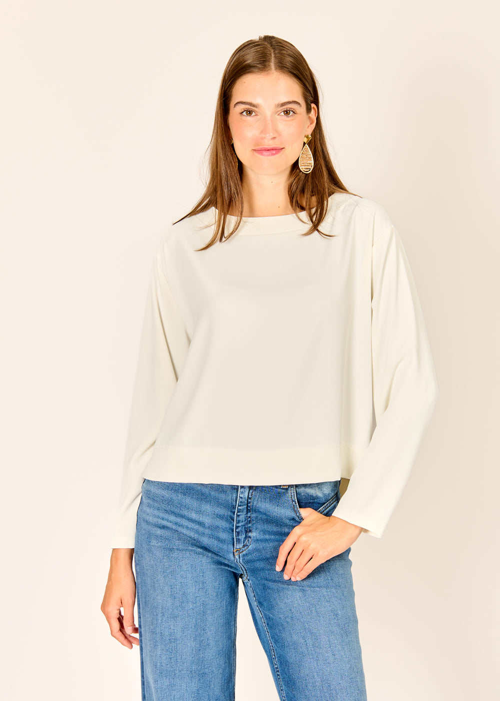 Dieses luxuriöse Langarmshirt in Crème-Weiß besticht durch seine schlichte Eleganz und den edlen U-Boot-Ausschnitt. Gefertigt aus einem fließenden Material, umspielt es sanft die Figur und bietet ein unvergleichlich angenehmes Tragegefühl. Ein vielseitiges Basic, das sowohl solo als auch unter einem Blazer getragen werden kann und jedem Outfit eine raffinierte Note verleiht.