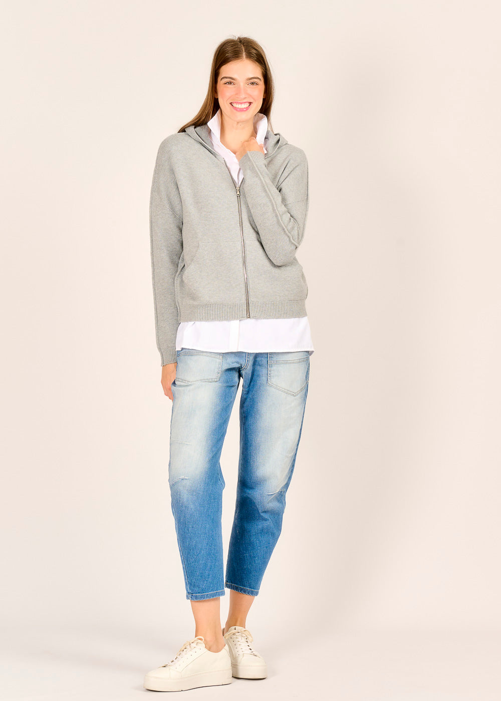 Genieße luxuriösen Komfort mit unserer edlen Strickjacke in sanftem Grigio. Die hochwertige Verarbeitung und das kuschelige Material machen sie zu deinem neuen Lieblingsteil. Ein besonderes Detail ist die seitliche Naht an den Ärmeln, die dem lässigen Hoodie-Schnitt eine moderne Note verleiht. Egal, ob über einem Hemd oder T-Shirt, diese Strickjacke ist perfekt für einen stilvollen und entspannten Look.