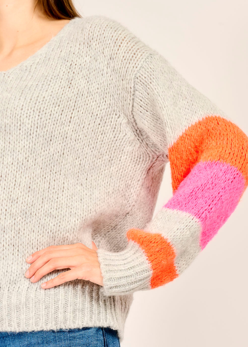 Füge deiner Garderobe einen Farbtupfer hinzu mit unserem Pullover in meliertem Grau. Das weiche Material sorgt für ein kuscheliges Tragegefühl und macht ihn zum perfekten Begleiter für kühle Tage. Ein echter Hingucker sind die bunten Ringel in Pink, Orange und Weiß an den Ärmeln. Mit seinem lässigen V-Ausschnitt passt er perfekt zu Jeans und verleiht deinem Outfit einen coolen und entspannten Look.