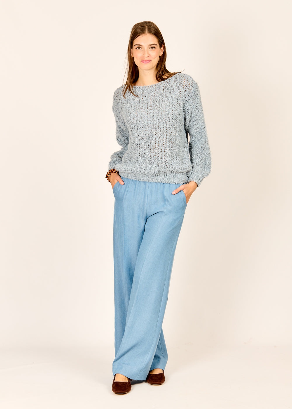 Der Bouclé-Pullover in zartem celeste verleiht jedem Outfit eine frische und zugleich edle Note. Seine charakteristische, strukturierte Oberfläche macht ihn zu einem besonderen Blickfang mit kuscheligem Wohlfühlfaktor. Der lockere Schnitt sorgt für lässige Eleganz und hohen Tragekomfort. Perfekt kombiniert zu Jeans oder Rock wird er zum stilvollen Begleiter für moderne Alltagslooks.
