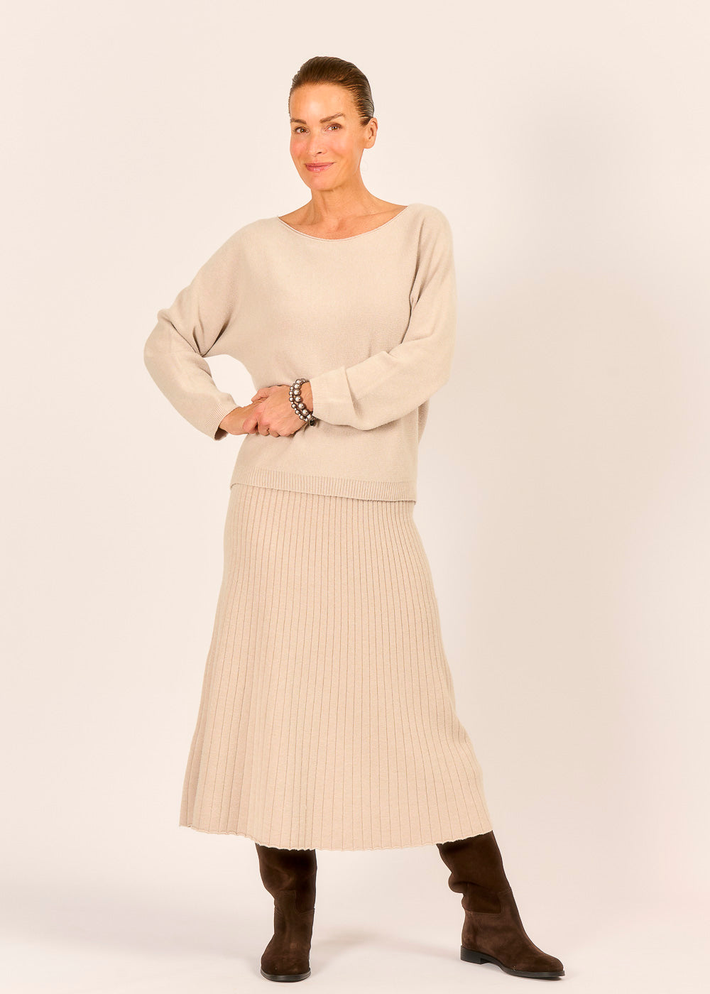 Der Rippenstrickrock in hellem Sandton strahlt schlichte Eleganz und natürliche Wärme aus. Seine feine Struktur betont sanft die Silhouette und sorgt für ein angenehmes Tragegefühl – perfekt für jeden Tag. Ein vielseitiges Basic, das sich mühelos von lässig bis elegant kombinieren lässt.