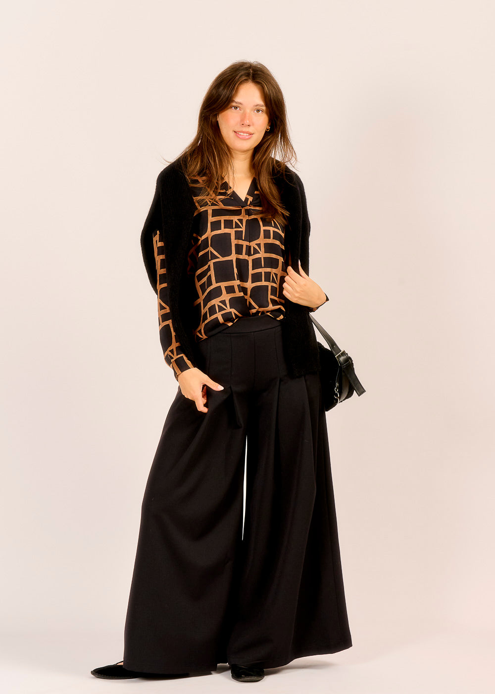 Diese schwarze Hose mit Bundfalten ist schlicht im Ton, aber stark im Ausdruck. Die Bundfalten verleihen ihr jenen Hauch von Raffinesse, der aus einem Kleidungsstück einen echten Blickfang macht. Ob du sie im Alltag trägst, im Office oder zu besonderen Momenten – jedes Outfit wirkt wie selbstverständlich durchdacht.