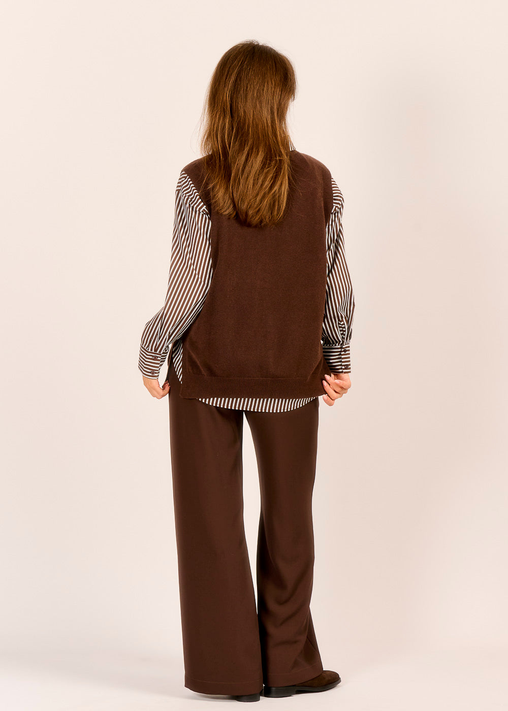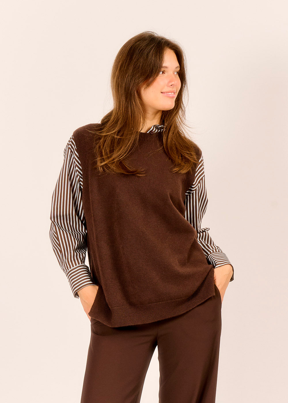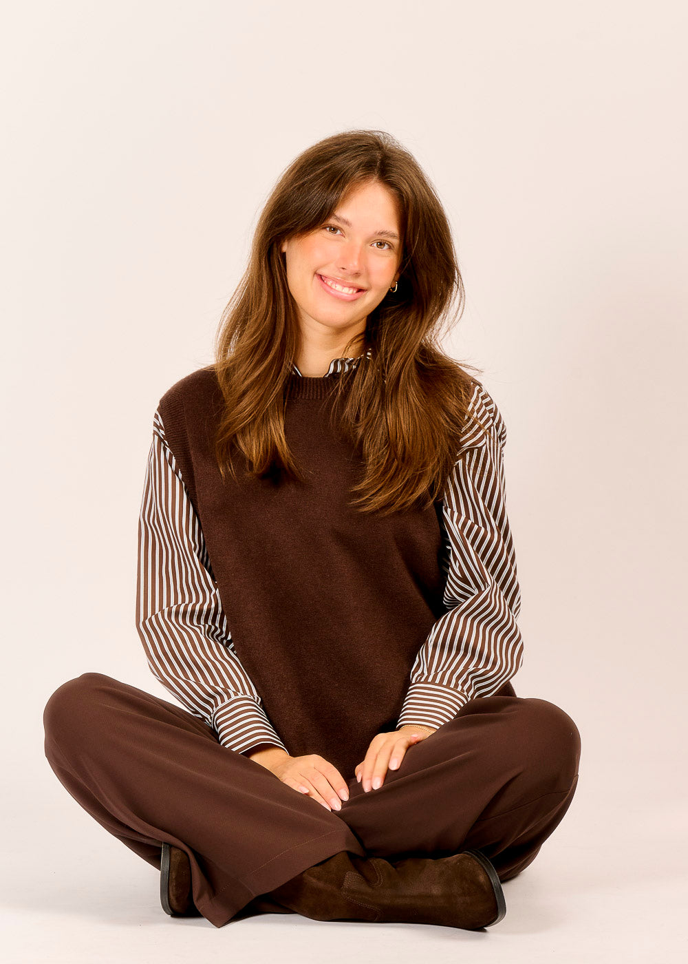 Subtile Eleganz: Dieser moccafarbene Pullunder ist ein Layering-Piece für Tage, an denen du dich einfach wohl und gleichzeitig wunderbar angezogen fühlen möchtest. Der edle Farbton verleiht jedem Look eine besondere Tiefe. Über einer Bluse getragen entfaltet er seine ganze Raffinesse.
