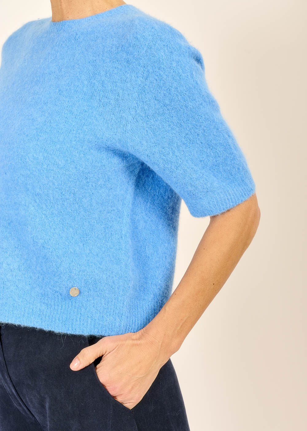 Der Halbarm Strickpullover mit feinster Baby Alpakawolle strahlt wie der Himmel über der Toskana und bringt Frische in deinen Look. Kombiniert mit einer Ballon-Pantalone wirkt der moderne Schnitt besonders edel.